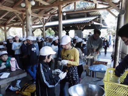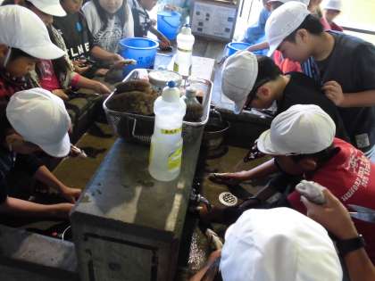 自分たちで捕まえた魚をさばきます。説明を聞いて,道具を揃えてスタートしました。