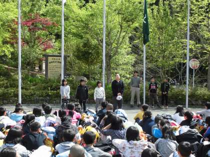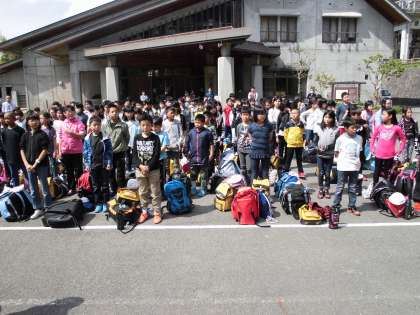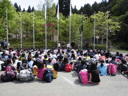 お世話になった山の家。たくさんのことを学習した3泊4日でした。これから学校へ向かいます。