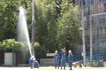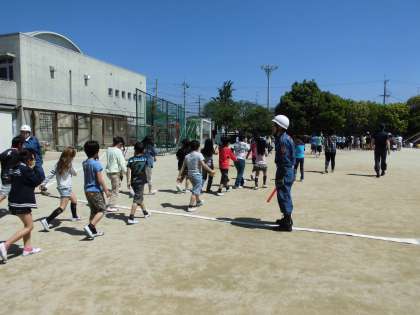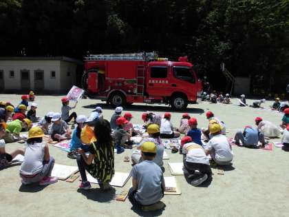 火災の訓練です。「おはしもて」を守って,しっかり避難することができました。消防署の方,消防団の方にもいろいろ教えていただきました。避難訓練後には,消防車や救急車の絵をかく学年もありました。防火防災意識をより高めていきたいと思います。