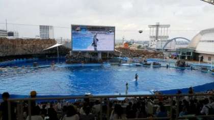 名古屋港水族館に着き,昼食(天むす弁当)を食べ,イルカショーを見学しています。雨は降っていないようです。