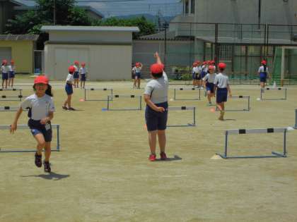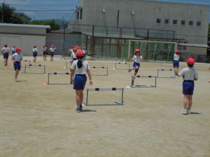 4年生は体育の学習でハードル走をしています。