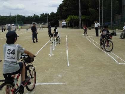 交差点や曲がり角での安全確認,一時停止や駐車車両の追い越し方,さらにはジグザグ走行の練習を終えた子どもたちは,ヘルメットをかぶっていよいよ試験にチャレンジです。それぞれのポイントでは,スタッフの皆様がしっかりチェックしてくださいました。暑い陽射しの中でしたが,緊張しながらも,しっかりと練習・試験に臨んでいました。
