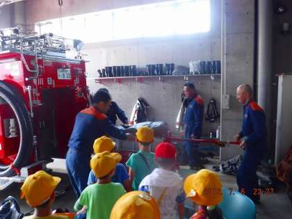 神川消防出張所では,火事のときに着る上着や,ヘルメット,酸素ボンベを身に着けさせてもらいました。身に付ける物の重さは合計20kgにもなるそうです。子どもたちは,「重すぎてもてないー!」「こんな重いものを持って動けないよ!」と,その重さにとても驚いていました。