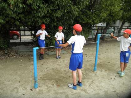 体育の学習「鉄ぼう」で,いろいろな技に挑戦しています。