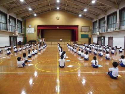 今日は体育館で「花笠音頭」の練習です。