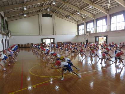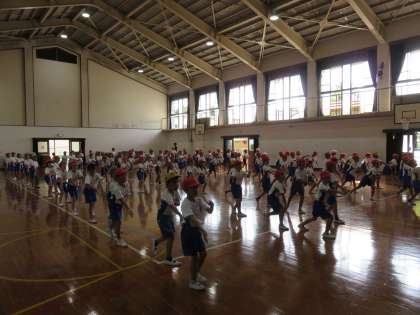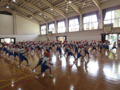 暑い日が続く中,ソーラン節の練習頑張っています。演技に入る前には,またわり30秒!!腰を深く落とすことが,苦手だった子ども達も,どんどん上達しています。運動会,楽しみにしていてください。