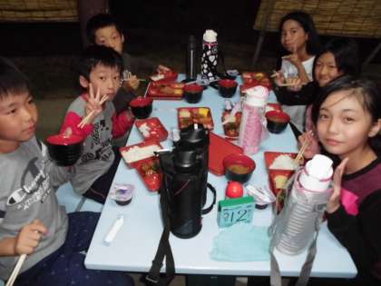 二日目の夕ご飯です。元気いっぱいです。これから楽しみにしていたキャンプファイヤーです。
