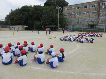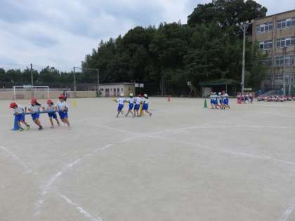 4人のお友だちと力を合わせて取り組む台風の目!!一本の棒を持っているので,足並みをそろえて同じ速さで走らなければいけません。とても難しい競技にチャレンジしますので,楽しみにしていてください。
