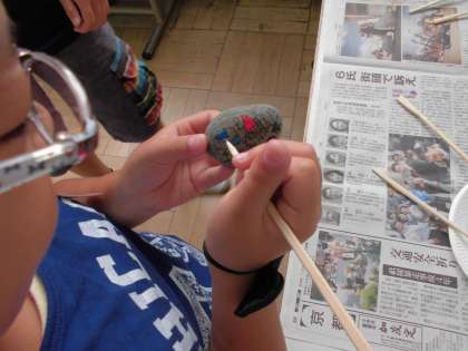 みさきの家での磯観察で拾ってきた石に絵を描きました。思い出に残っている場面の絵を描いたり,メッセージを書いたりして,アクリル絵の具で色付けをしました。