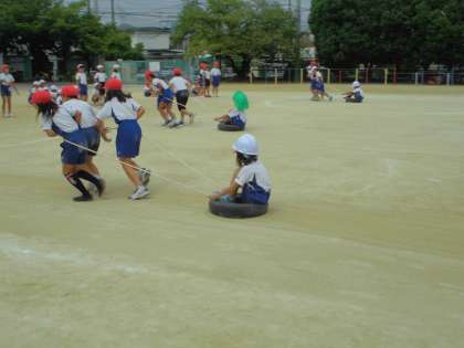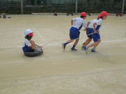 今年の学年競技は「タイヤレース」です。友だちと協力して,タイヤを上手に引っ張っています。