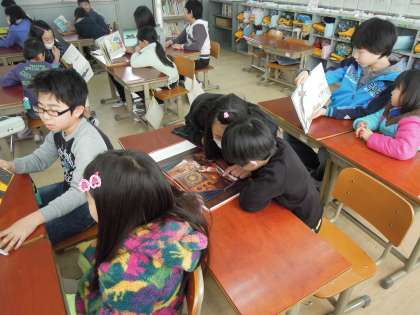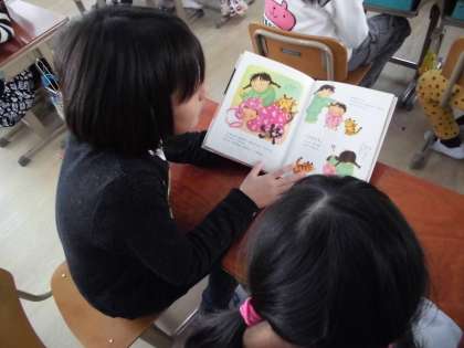 高学年のお兄さん・お姉さんたちが低学年に本の読み聞かせをしてくれます。