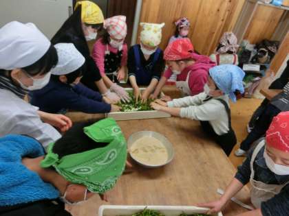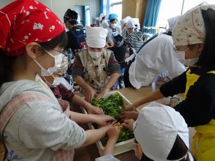 女性会の方々に教えていただき,2年生と6年生で協力して久我菜漬作りに取り組みました。2年生の手が届きやすいように容器の場所を移動する等,とても優しい姿で2年生に接していました。月曜日に出来上がった久我菜漬を持って帰るのが楽しみです。