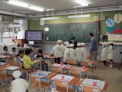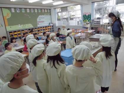 今年度2回目の給食でした。1年生の給食当番の児童も先生のお話をよく聞いて準備しました。