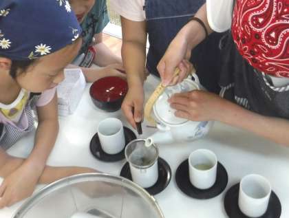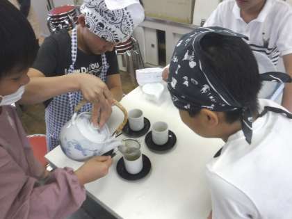 今日は,家庭科の学習で「お茶」を入れました。自分たちでお湯を沸かし,きゅうすと茶こしを上手に使いながら,温かいお茶を入れることができました。子どもたちは「少し苦いけど,おいしい!」「心が温まる〜!」と,お茶を味わっていました。