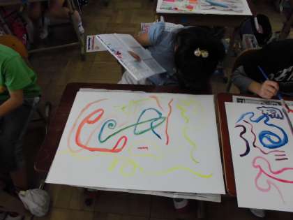 波線や直線,曲線などを思い思いに画用紙に線を引いていきます。