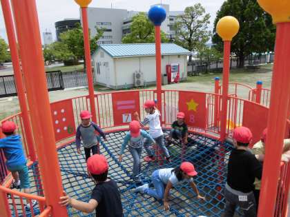 遠足で淀競馬場のみどりの広場へ行きました。広い芝生や大きい遊具があり,思いっきり体を動かして楽しむことができました。