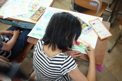 前回に絵の具で描いた線を見て,楽しくなる世界を想像して,生き物や人などをクレパスでかき足しています。