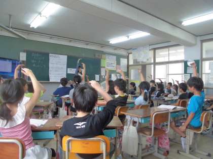 音楽の学習では,週1回教務主任の沖先生と一緒に学習しています。今週は,歌「いいことありそう」を通して,リズムについてや歌い方について教えていただきました。