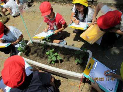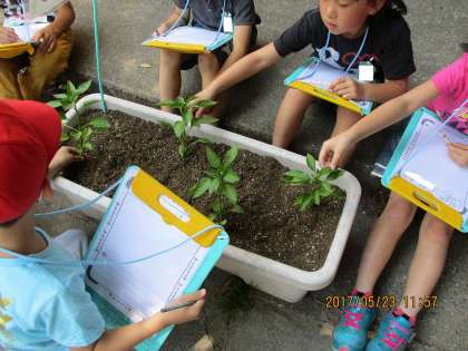 自分の鉢にはミニトマトを,学校の畑にはサツマイモ,南校舎の裏には夏野菜を植えました。植えた野菜は,きゅうり,ナス,ピーマン,枝豆,オクラです。