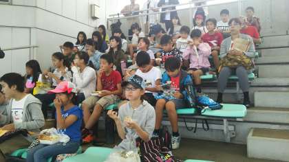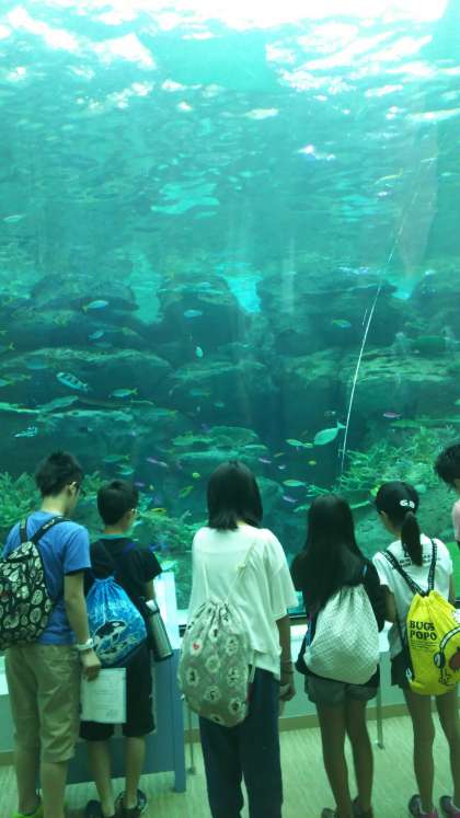 イルカショーを見ながらおいしくお弁当をいただき,グループごとで館内を見学しています。