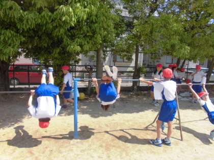3年生までに学習した鉄棒の技や4年生になって初めて知った技などいろいろな技にトライしました。(さすが4年生!正しい握り方で取り組んでいます)