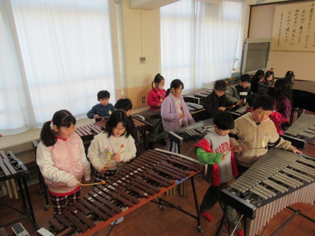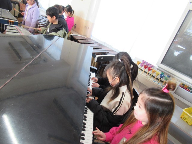 音楽室にはピアノや木琴、鉄琴などがあり、