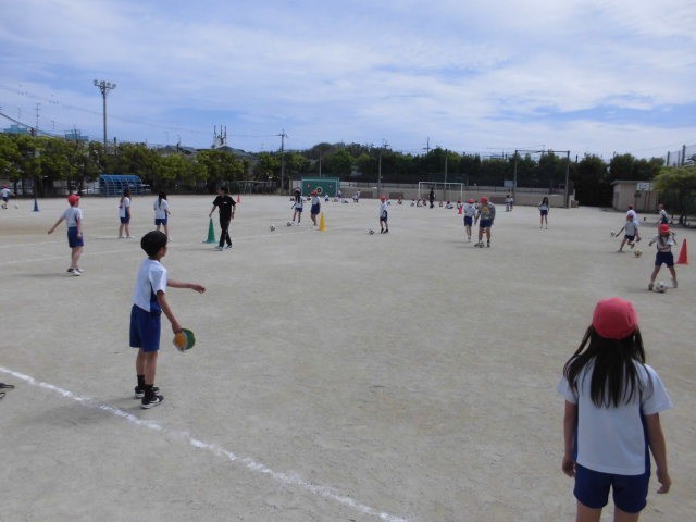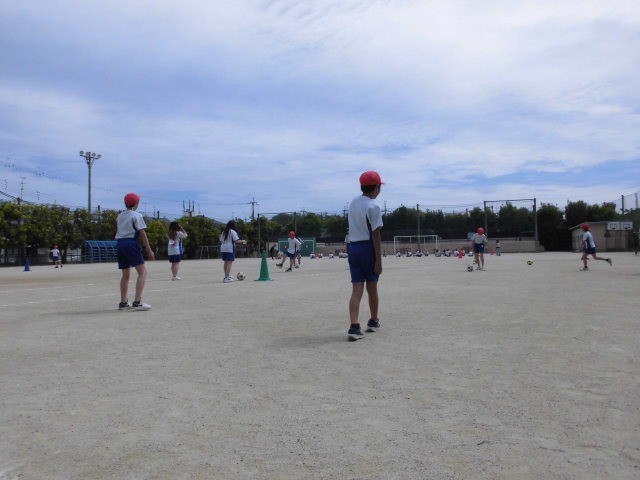 6年生は体育の時間にサッカーをしました。相手をよく見て、丁寧にボールを蹴る練習をしました。