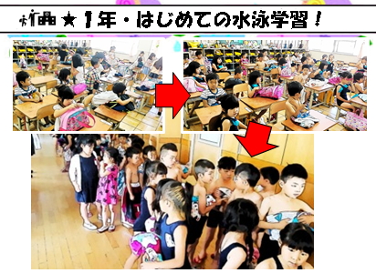 教室で,プールチェックカードのチェックを受け,健康観察の後,今日のプール学習について知り,いよいよ,水着に着替えます!