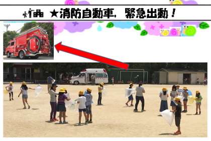 消防自動車が子どもたちのために,音を鳴らしてくれているんだ〜と思って,運動場を見ると・・・
