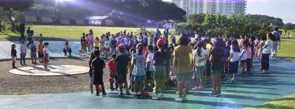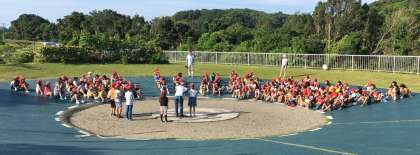 まぶしく朝日輝くなか,最後の朝の集いをしました!