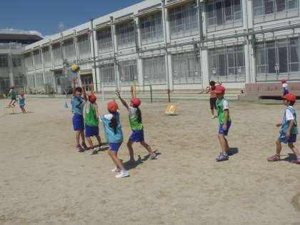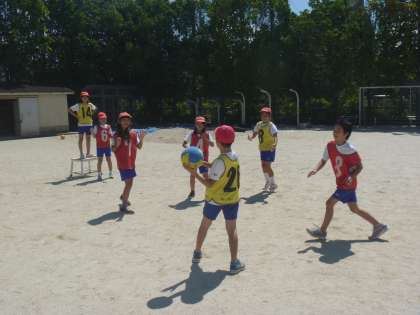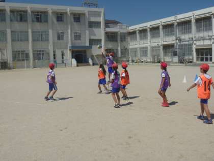 初めはパスを受けたり,投げたりするのも大変でしたが,今は「いかにじゃまされないところで受けるか」「シュートしやすいパスを出すことができるか」というところまで上達してきました。毎回楽しくがんばっています。