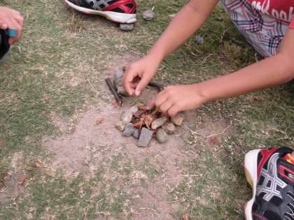 石と落ち葉でかまどを作る子、