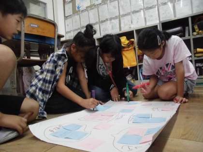 気候ネットワークの方に来ていただき,夏休み中に行ったエコライフについてグループで発表し,それを模造紙にまとめました。
