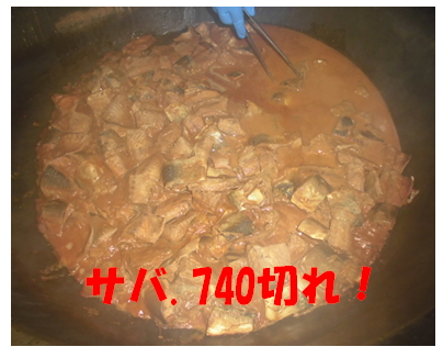 さば,白ねぎ,しょうが,赤みそ,三温糖,料理酒,濃口しょうゆを使ってさばを煮ました。さばは1年生から6年生まで1人1切です。クラスの人数に合わせて1つ1つ数えていきます。740切のさばを2人で丁寧に配缶しました。もちろん,白ねぎ,しょうがも煮汁と一緒に。じっくり弱火で煮含めました。