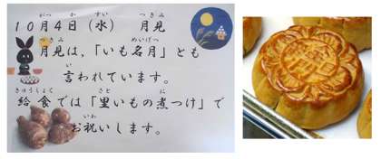今年の月見は本日10月4日です。本日は,「里いもの煮つけ」でお祝いしました。調べてみると月見は日本だけでなく,アジアの国々でも行われている行事のようです。中国では月餅で,韓国では里いもやスターフルーツ,ヒシなどでお祝いします。