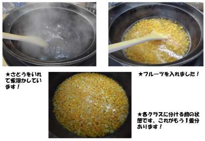 調理のポイントは,寒天を煮溶かして,かたまることを確認してから砂糖を入れること。かたまっていないタイミングで入れてしまうと,その後冷えてもなかなか固まりません。子どもたちが食べるころに固まるように時間を逆算して調理しました。