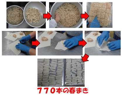 給食室で1つ1つ手作業で巻いていきます。もちろん中の具材も手作りです。全部で770本巻きました。