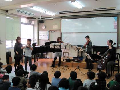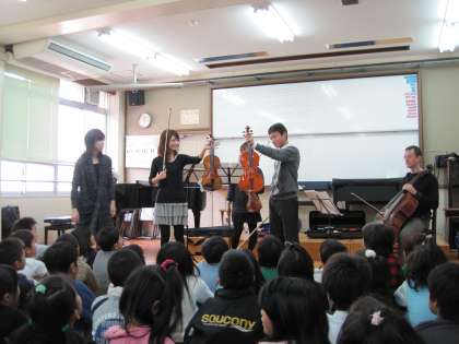 スクールサポーターの池田先生のプロデュースで,音楽に親しみ触れ合う学習を進めています。ステキな音楽を体中で感じていました。ヴァイオリンの演奏も楽しく体験しました。