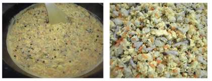 高野どうふはだし汁・さとう・しょうゆで煮汁を作り一度炊きます。野菜も同様にだし汁・さとう・しょうゆで作った煮汁で炊きます。野菜がやわらかくなってきたら高野どうふを加えて再び煮ます。最後に九条ねぎを加え,卵を入れて加熱したら完成です。