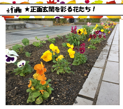 これからも,ビオラ,パンジー,キンギョソウ,サクラソウ,チューリップが正面玄関を彩ってくれます!