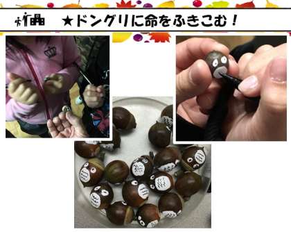 子どもたちにも,ひろったドングリに命をふきこんでもらいました!