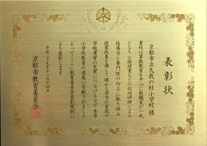 「算数教育を中心に教職員が一丸となり,公開授業などの校内研修による指導力と専門性の向上に取り組み,授業改善を通して,確かな学力の育成や学級運営の充実につなげるなど,本市小学校教育の進展に貢献された。」と評価されました。