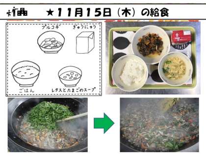 プルコギは当初まいたけ使用の予定でしたが,10月に発生しました台風21号,22号の影響により中央市場への流通量が減ったため,必要量の調達が困難となり,本日は,しめじの使用となりました。