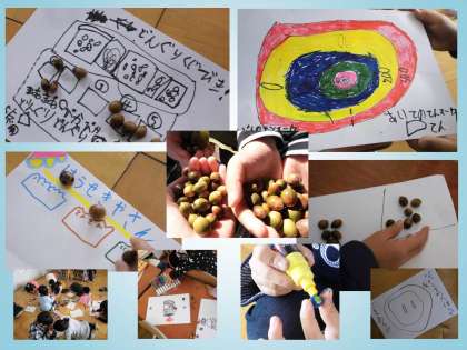 運動場でどんぐりを拾い,色々な遊びを考えました。