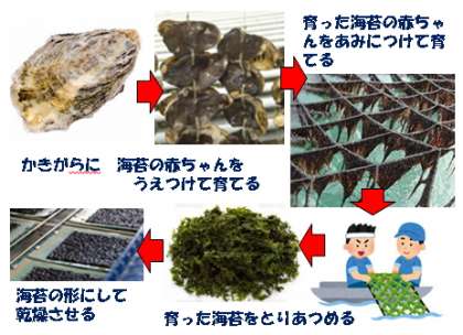 1)4〜9月→海苔の赤ちゃんをかきの貝殻にいれて,育てる。