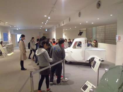 展示館では,車を利用する人のニーズに合わせて,時代ごとに発展してきた自動車づくりの歴史を学びました。現代は環境や安全性能に注目した開発が行われているようです。