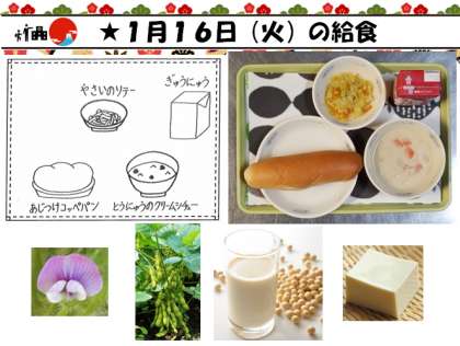 明日はカレーピラフ,トマトスープ,みかん。防災とボランティアの日という行事献立です。1995年1月17日は阪神・淡路大震災が起こった日。