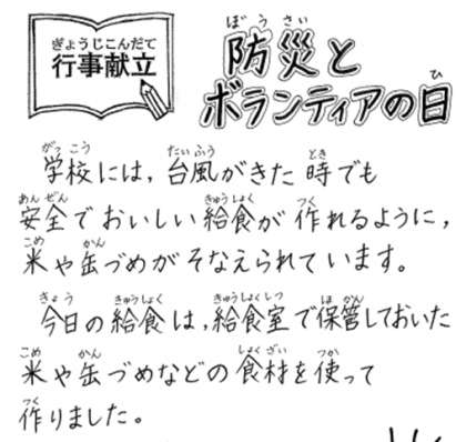 今日の給食は,給食室で保管しておいた米や缶詰などの食材を使ってつくりました。