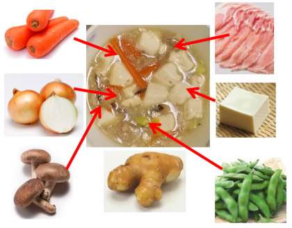 豚肉・とうふ・たまねぎ・にんじん・枝豆・干しいたけを使用しました。