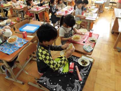 中間休みの頃からカレーのいい匂いがしてきて,大喜びの子どもたち。